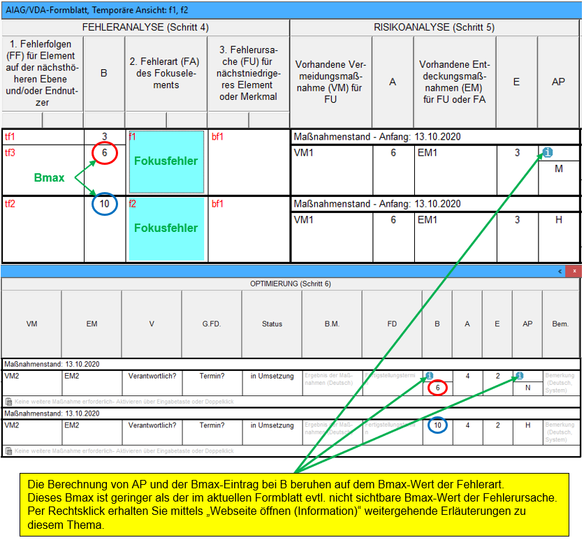 Für die Fehlerursache bf1 ergibt sich ein Bmax von 10. Für die Fehlerart f1 erhält man ein Bmax von 6 und für die Fehlerart f2 wiederum ein Bmax von 10. Für die Spaltenbefüllung im AIAG/VDA-Formblatt hat es deshalb unterschiedliche Auswirkungen, wenn man bei den allgemeinen Dokumenteinstellungen das obige Häkchen setzt oder weglässt.